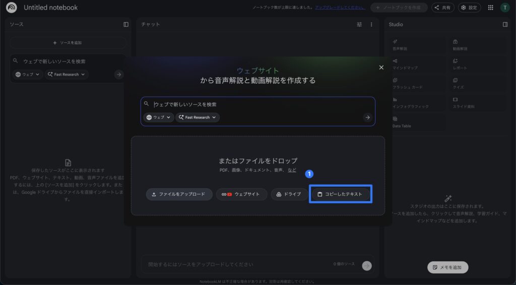 ソースを追加する NotebookLMを開き、「ソースを追加」をクリック。Perplexityの回答をコピー&ペーストするか、参考にしたWebページのURLを貼り付けます。